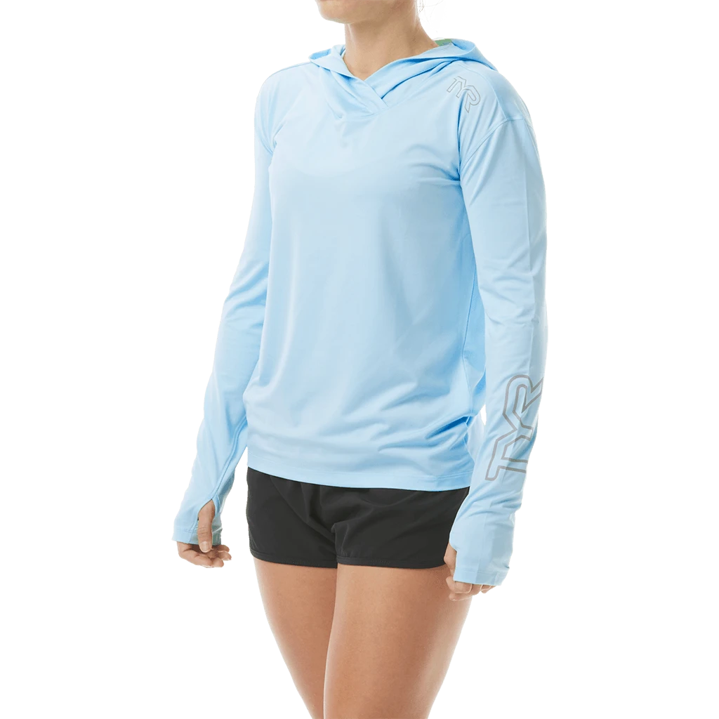 Gear up in the TYR Women’s SunDefense Hooded Shirt. The TYR SunDefense collection has the most effective UV protectant coverage for outdoor adventurists. With UPF 50+ to block UVA and UVB rays for hard-core sun protection, in addition to SunDefense QuickDry, moisture-wick fabrication and superior breathability, the SunDefense apparel is a must-have for any athlete’s arsenal.